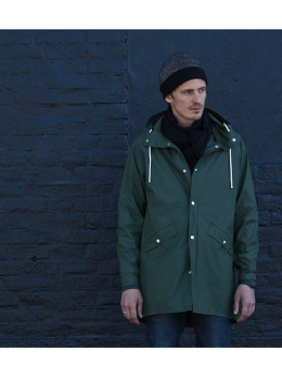 Unisex-Regenjacke mit verstellbarer Kapuze. Wasserdichtes Gewebe und versiegelte Nähte.