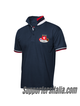 Short-sleeved polo shirt with three buttons. Reverse collar, neck ribbon, sleeve edge and multi-colored side vents. Slim-fit fit.