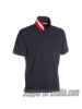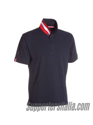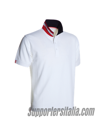 Short sleeve polo shirt with three buttons in the same color with a pearl effect, collar on one side in the same color, on the other in contrast with tricolor visible only when raised, right sleeve edge with fine tricolor insert in contrast, ribbed sleeve edge, side vents with tricolor, neck seams covered with tricolor jersey tape, side reinforcement tape.