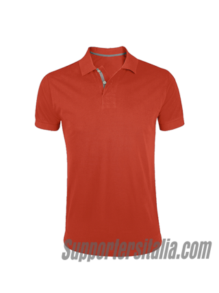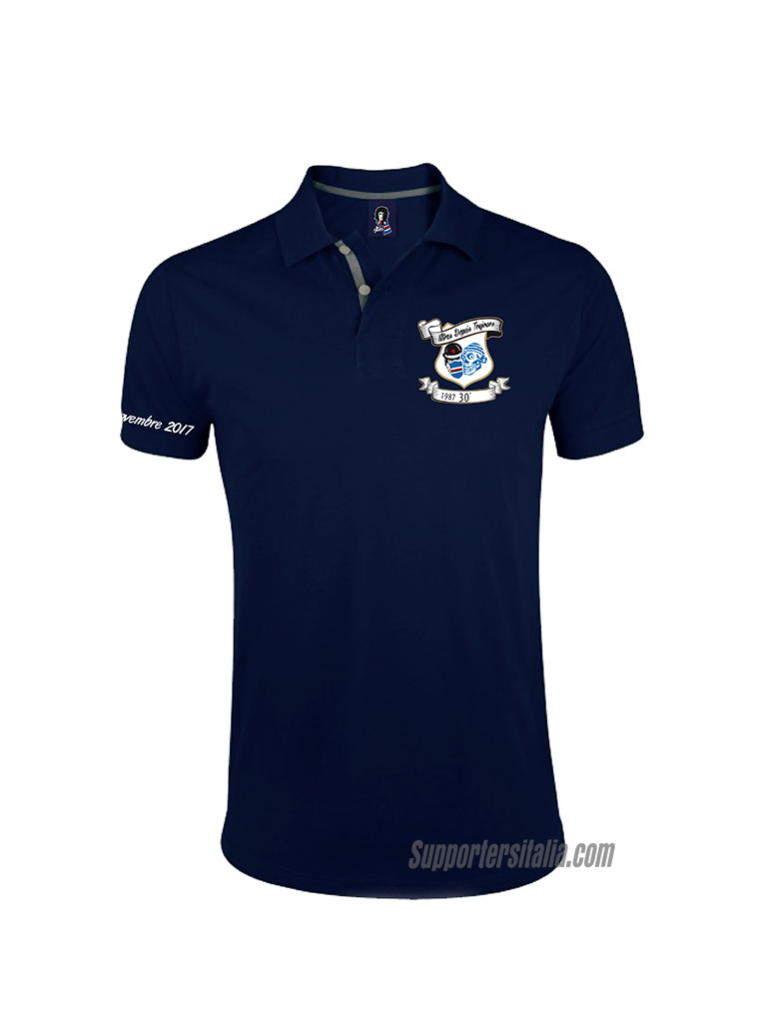 Ribbed collar and armholes. Reinforcement tape on the neck. 2 pearl white buttons. Contrasting details on: right sleeve, buttoning, internal side slits and reinforcement tape. Spare button sewn inside