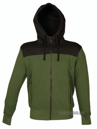 Felpa in french terry, Spalle e cappuccio in contrasto, Cappuccio con cordini, Colletto rialzato, Zip lunga nastrata in contrasto, Due tasche con zip nastrate in contrasto, Polsini e fondo maglia in costina elasticizzata, Nastro di rinforzo interno collo, Cuciture ribattute